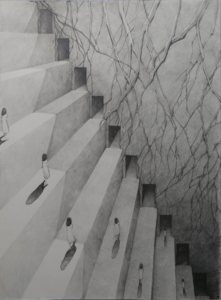 계단은 표면적으로 놀이의 대상이었지만 그 시절의 상황이 녹아든 회색계단은 오르고자 하는 욕망과 올라오기를 허락하지 않는 공포의 이중성을 간직하고 있습니다. 또한 보편적 비율보다 더 크게 그려진 계단들은 곧 어른의 부재와 관심 받지 못했던 소녀의 자괴감을 표현하는 수단이기도 합니다.